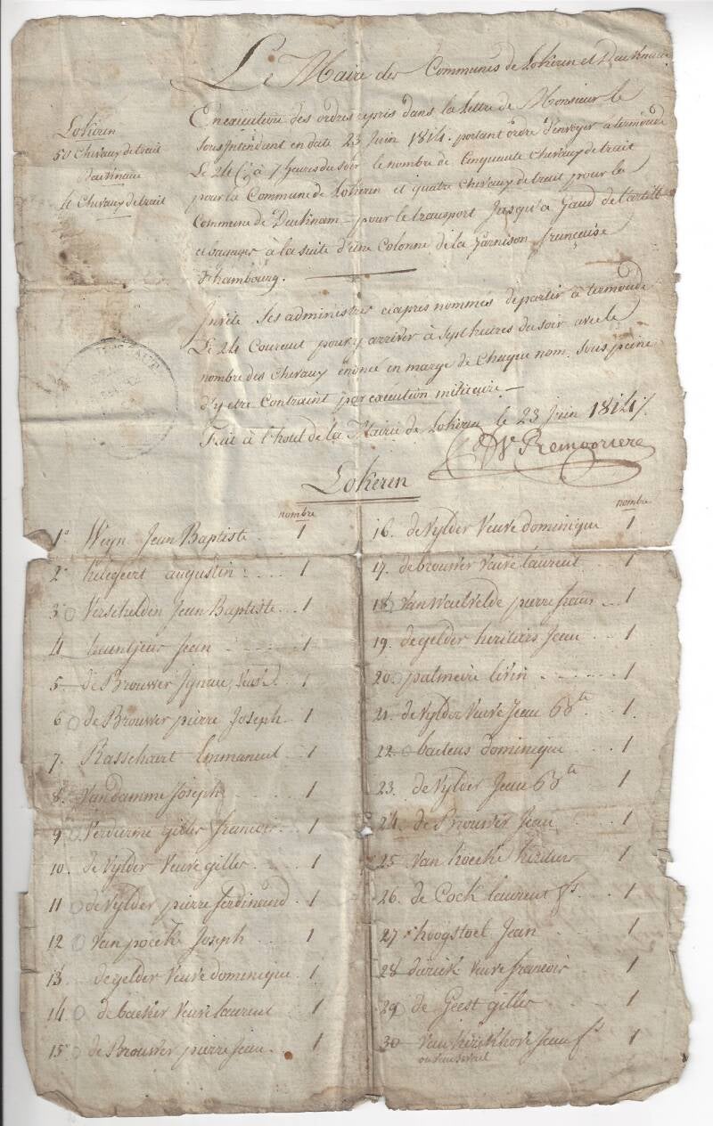 Onlangs vonden we bij mijn schoonouders verschillende oude aktes en andere papieren, waaronder hetgeen hier bijgevoegd. Een geschrift van 23 juni 1814 waarin de namen staan van 50 personen uit Lokeren en Daknam die een paard moesten afstaan aan "Garnison Française d'hambourg" . Op de tweede bladzijde is jammer genoeg achteraf iets bijgeschreven. Weet iemand hier iets meer over? Misschien interessant voor sommige familieleden? Wat doen we best met zo’n papier?