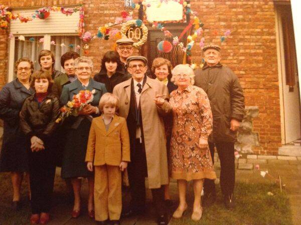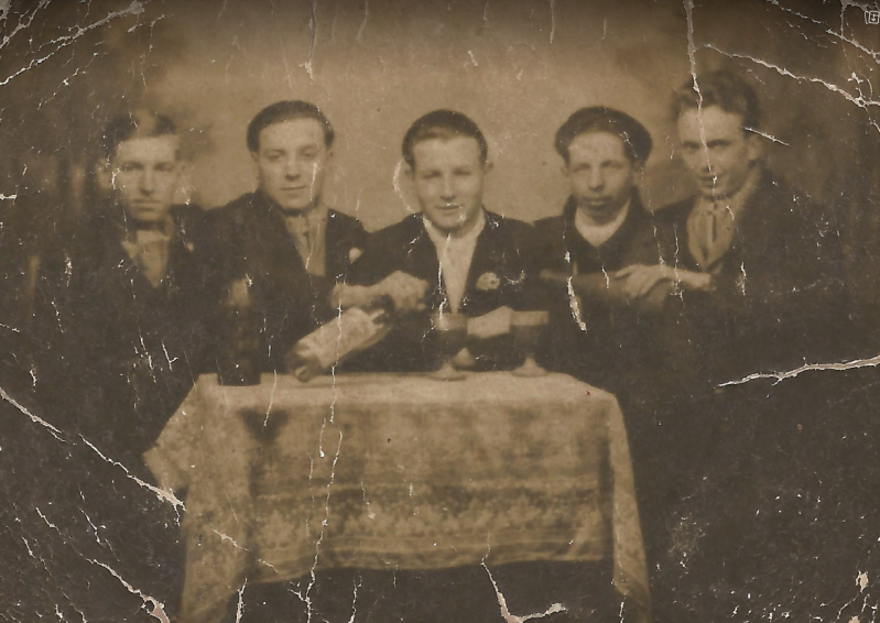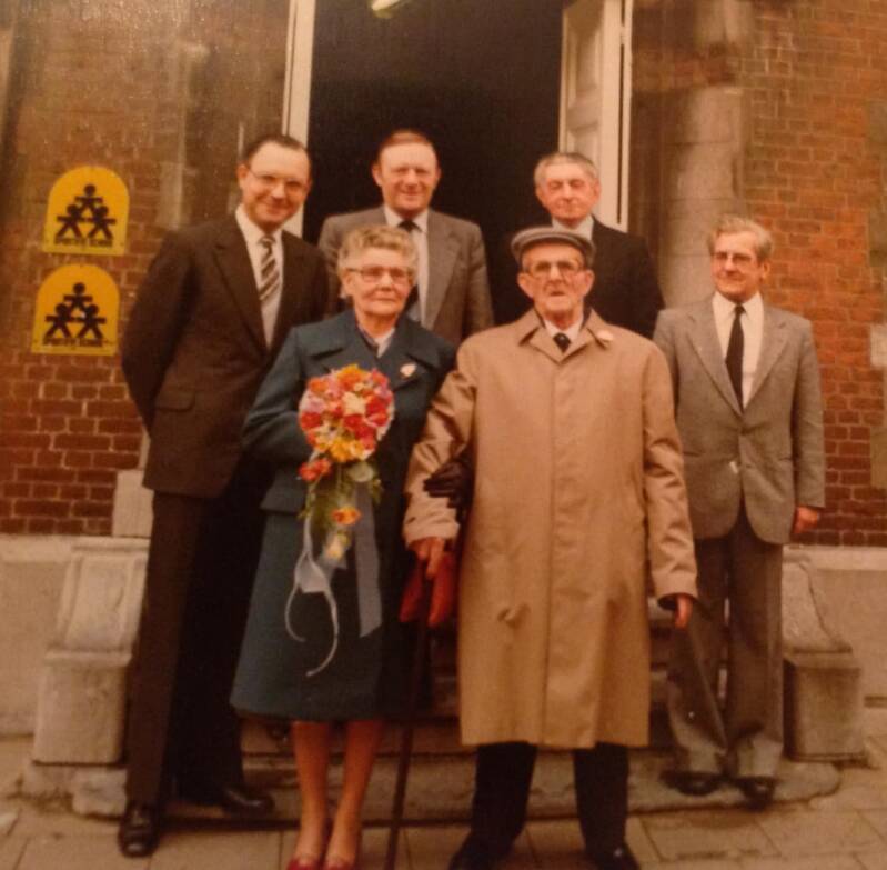 Rechts van de bruid staat Jean (Beuzze) Vanhaesendonck, de dameskapper. Links achter hem, met hoed, Raymond den agent ? Het ventje op de voorgrond is Franske Vanhaesendonck, vroeger apotheker in Melsbroek,